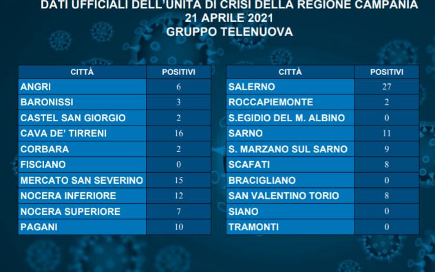 Calo dei tamponi positivi anche in provincia di Salerno anche se alcune città non indietreggiano nel numero dei contagi. La città capoluogo conta oggi 27 nuovi contagi. Nel territorio provinciale è Cava de’ Tirreni a registrare il dato più alto, 16. A seguire c’è Mercato San Severino con 15 casi, Nocera Inferiore 12, Sarno 11, Pagani e San Marzano sul Sarno 9. Poi Scafati e San Valentino Torio 8. Diverse le città che oggi sono Covid free, Fisciano, Sant’Egidio del Monte Albino, Bracigliano, Siano e Tramonti non hanno avuto nessun contagio nelle ultime 24 ore.
