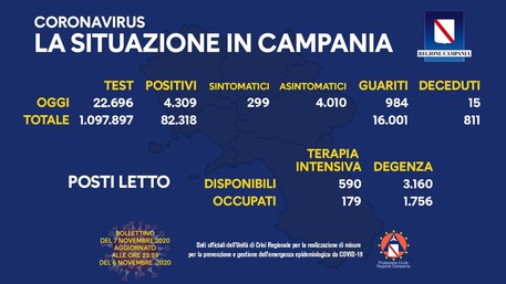 La curva epidemiologica in Campania continua a salire di settimana in settimana. I dati del contagio odierni, emanati alle 17 dall’unità di crisi, confermano la critica situazione della regione: oggi la Campania ha registrato un incremento di 4309 nuovi casi di Covid-19, a fronte di 22. 696 tamponi effettuati. Cala, tuttavia, la curva dei decessi (+15), mentre continua a salire il numero dei ricoveri ordinari (+79).