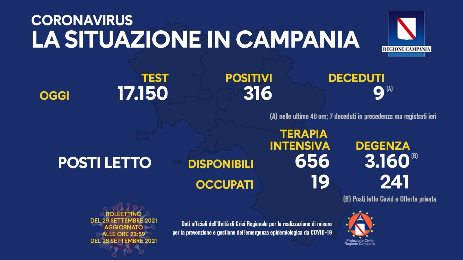 In Campania secondo il bollettino diramato dall’Unità di crisi regionale sono 316 i casi Covid 19 riscontrati su 17.150 tamponi molecolari processati. Negli ospedali campani, i posti letto occupati in terapia intensiva sono 19 su una disponibilità di 656, mentre nei reparti di degenza quelli occupati sono 241. Sono nove i decessi riportati dal bollettino odierno. La campagna di vaccinazione vede somministrate un totale di 7.720.637 dosi. I cittadini che hanno ricevuto la prima dose sono 4.129.604, di cui 3.591.033 hanno ricevuto la seconda dose.