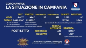 In Campania si registrano 994 casi di positività al Covid 19. Di questi, in 37 hanno manifestato sintomi. I tamponi processati nelle ultime 24 ore dai laboratori e ospedali campani sono stati 8.417. La percentuale tamponi in rapporto ai positivi è all’11.8%. Ieri il rapporto era all’8.2%. Il totale dei positivi sale, dunque, a 223.179 su 2.432.221 test effettuati dall’inizio dell’emergenza. Sono 1.075 le guarigioni riscontrate nelle ultime ore al coronavirus. Gli ammalati guariti sono stati 157.081. Sono otto i decessi riportati dal bollettino odierno, sei dei quali avvenuti negli ultimi due giorni. I posti di terapia intensiva occupati sono 97, due in meno rispetto a ieri. mentre i posti di degenza occupati sono 1.437.