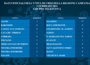 Secondo i dati ufficiali diramati dall’Unità di crisi della Regione Campania, nell’area nord della provincia di Salerno è la città capoluogo che risulta essere ancora quella con un maggiore incremento di Covid 19. A Salerno città sono 37 i tamponi individuati positivi al coronavirus. Dopo il dato preoccupante delle scorse 24 ore, calano nell’Agro nocerino i tamponi positivi, due a Nocera Inferiore, Nocera Superiore e Angri.; un solo positivo a Scafati e Pagani, così come a Cava de’ Tirreni. Nessun contagio a Sarno, Castel San Giorgio, Roccapiemonte, San Valentino Torio, San Marzano sul Sarno, Sant’Egidio del Monte Albino, Corbara, Siano e Bracigliano. Situazione simile anche a Vietri sul Mare. Nella Valle dell’Irno l’unità regionale ha riscontrato due positivi al virus, entrambi a Fisciano. Nessun caso, dunque, a Baronissi e Mercato San Severino.