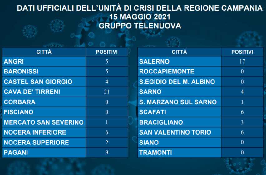 Il calo dei contagi che si è registrato in Campania è evidente anche in provincia di Salerno. La città dove si sono registrati più tamponi è Cava de’ Tirreni con 21 nuovi casi. Segue Salerno con 17. Poi Pagani con nove. Seguono Nocera Inferiore, Scafati e San Valentino Torio con sei nuovi tamponi. Angri e Baronissi hanno cinque contagi. A seguire tutte le altre città. Nessun tampone positivo a Corbara, Fisciano, Roccapiemonte, Sant’Egidio del Monte Albino, Siano e Tramonti