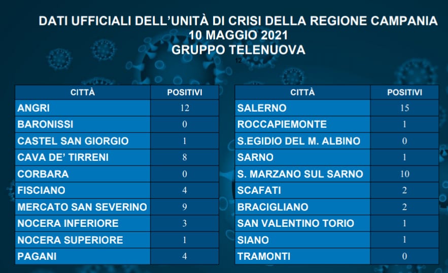 Il calo di contagi in Campania si riflette anche in provincia di Salerno. La città capoluogo registra il maggior numero di tamponi positivi, sono 15. Ad avere più positivi nell’Agro nocerino sarnese sono Angrim 12 contagi, e San Marzano sul Sarno, dieci. Tutte le altre città si mantengono ben al di sotto, Pagani quattro, Nocera Inferiore tre. Cava de’ Tirreni ha registrato otto nuovi tamponi positivi; a Mercato San Severino ne sono nove.