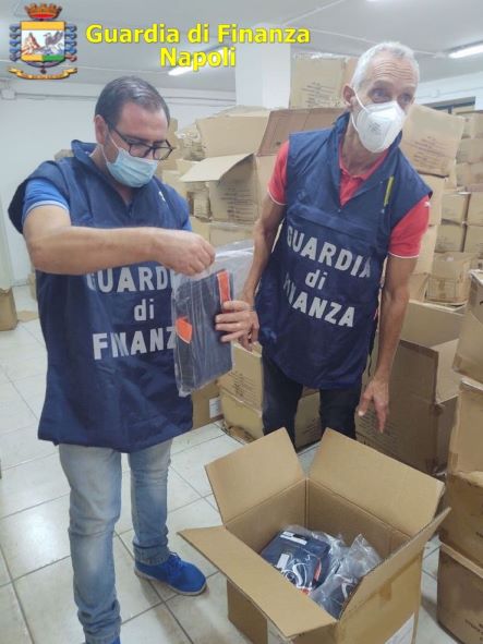 Nel corso di un secondo intervento, i “Baschi Verdi” del Gruppo Pronto Impiego hanno notato nel quartiere Fuorigrotta del capoluogo partenopeo, trasferimenti sospetti di merci e fermato un uomo che usciva da un edificio trasportando grandi buste di cellophane contenenti t – shirt prive di marchio.