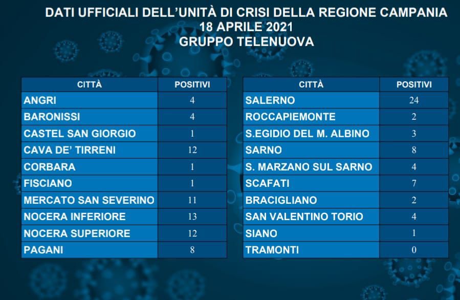 In provincia è Salerno a registrare il maggior numero di nuovi tamponi positivi, sono 24. A seguire c’è Nocera Inferiore con 13 contagi, Nocera Superiore e Cava de’ Tirreni con 13. A seguire Mercato San Severino che registra 11 positivi. Poi Pagani e Sarno con 8 e Scafati con 7. A seguire tutte le altre città con numeri più bassi.