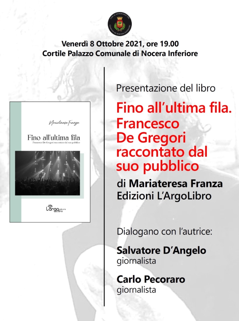 Ancora un evento che mette in primo piano la cultura e il mondo letterario. Debutta a Nocera Inferiore “Fino all’ultima fila – Francesco De Gregori raccontato dal suo pubblico” scritto dall’autrice Mariateresa Franza. Il libro è il risultato di un viaggio sulle orme del Principe, che l’autrice ha iniziato quando era adolescente. Mariateresa Franza ci dona pagine appassionanti e coinvolgenti, racconta se stessa, il suo rapporto con la musica e, in particolare, con De Gregori. Mostra spaccati inediti della sua storia. Un diario che la docente universitaria originaria di Nocera Inferiore apre ad altri fan, al pubblico di De Gregori. Ognuno, con scritti brevi o più lunghi, racconta l’incontro con il cantautore.