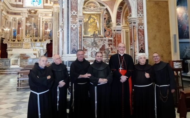 Il porporato, anche lui appartenente all’Ordine dei frati minori, ha avuto modo di visitare una dei più antichi santuari mariani della Campania, varcando la Porta Santa della basilica. Intenso ed emozionante è stato il momento di preghiera e di contemplazione, con l’alto prelato che ha sostato per alcuni minuti, in ginocchio, dinanzi all’icona della Vergine Bruna. Ad accompagnarlo “nella casa di Maria” padre Antonio Michele Ridolfi, padre provinciale dei Frati minori salernitana-lucana e tutta la comunità di frati custodi della Mater domini. “La Materdomini ponte di pace tra Oriente e Occidente”, le semplici parole di padre Antonio Domenico Pio Caldarelli, sottolineando l’importante momento vissuto questa mattina.