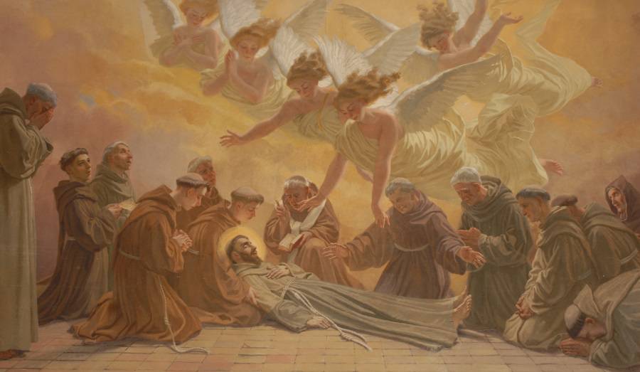 Testimoni dell’incontro del santo con la “sorella morte” sono stati i primi frati che hanno visto in lui l’immagine riflessa del Cristo crocifisso. Un’immagine di fraternità e di comunione tra fratelli stretti intorno a Francesco come in tutta la sua vita così sino alla fine. Il Poverello d’Assisi, oramai prossimo al trapasso, chiese a frate Elia di avvertire i suoi compagni, i fratelli della prima ora, per un ultimo saluto, rivivere quegli ultimi istanti ricordando le origini della loro esperienza. Piangevano i compagni del Santo, feriti e colpiti da tanta compassione, sapendo che quelli erano gli ultimi suoi momenti di una vita spesa nell’amore verso Cristo e nel servire ogni fratello. Se attorno a quella nuda terra si era celato un velo di tristezza, dall’alto vi era un fermento di gioia che vide gli angeli del cielo in festa nell’accogliere l’anima beata. Può non sembrare un caso se il 2 ottobre, giorno che precede il ricordo del Transito di San Francesco, la Chiesa abbia istituito il dogma degli Angeli.