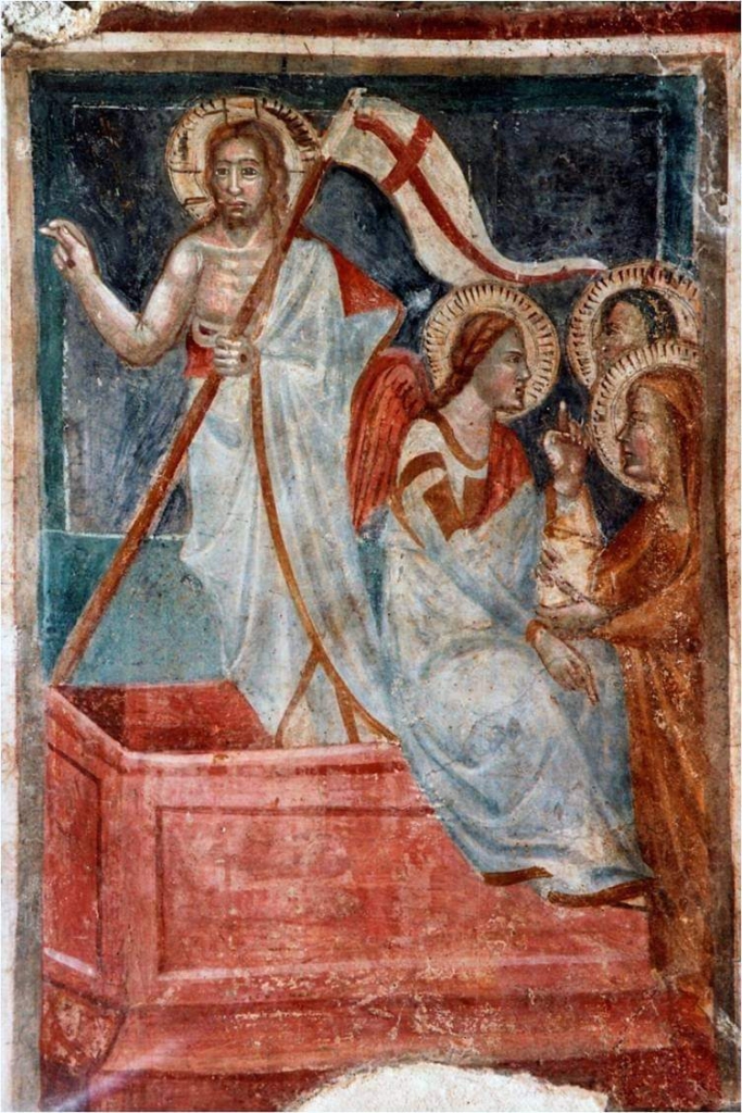 Iniziamo dal Battistero di Nocera Superiore, qui ci sono degli episodi della passione, uno è quello dell’andata al calvario, in questo caso la rappresentazione diventa viva, compartecipata con il corteo che accompagna Cristo con la croce e che si ricollega al dipinto nel chiostro del Paradiso del duomo di Amalfi e alla raffigurazione del convento di San Francesco a Giffoni Valle Piana. Poi c’è la Risurrezione che rappresenta la sintesi di queste primissime espressioni del Gesù che trionfa sulla morte, e l’Angelo, seduto sul sepolcro, addita alle donne che colui che cercano non è più lì, perché risorto.