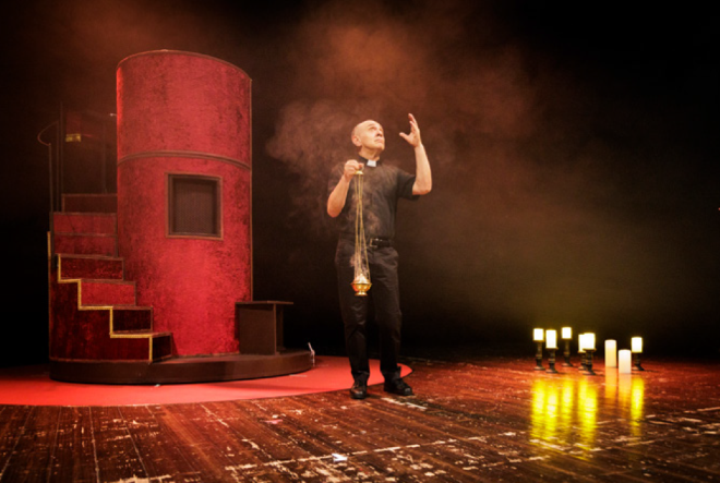 “La cerimonia del massaggio” con Gianluca Ferrato. Regia Roberto Piana e Angelo Curci. Traduzione Anna Marchesini. Drammaturgia Tobia Rossi. Scene Francesco Fassone. Costumi Agostino Porchietto. Light designer Renato Barattucci. Video designer Simone Rosset. Una produzione Società per Attori. Foto Neri Oddo.