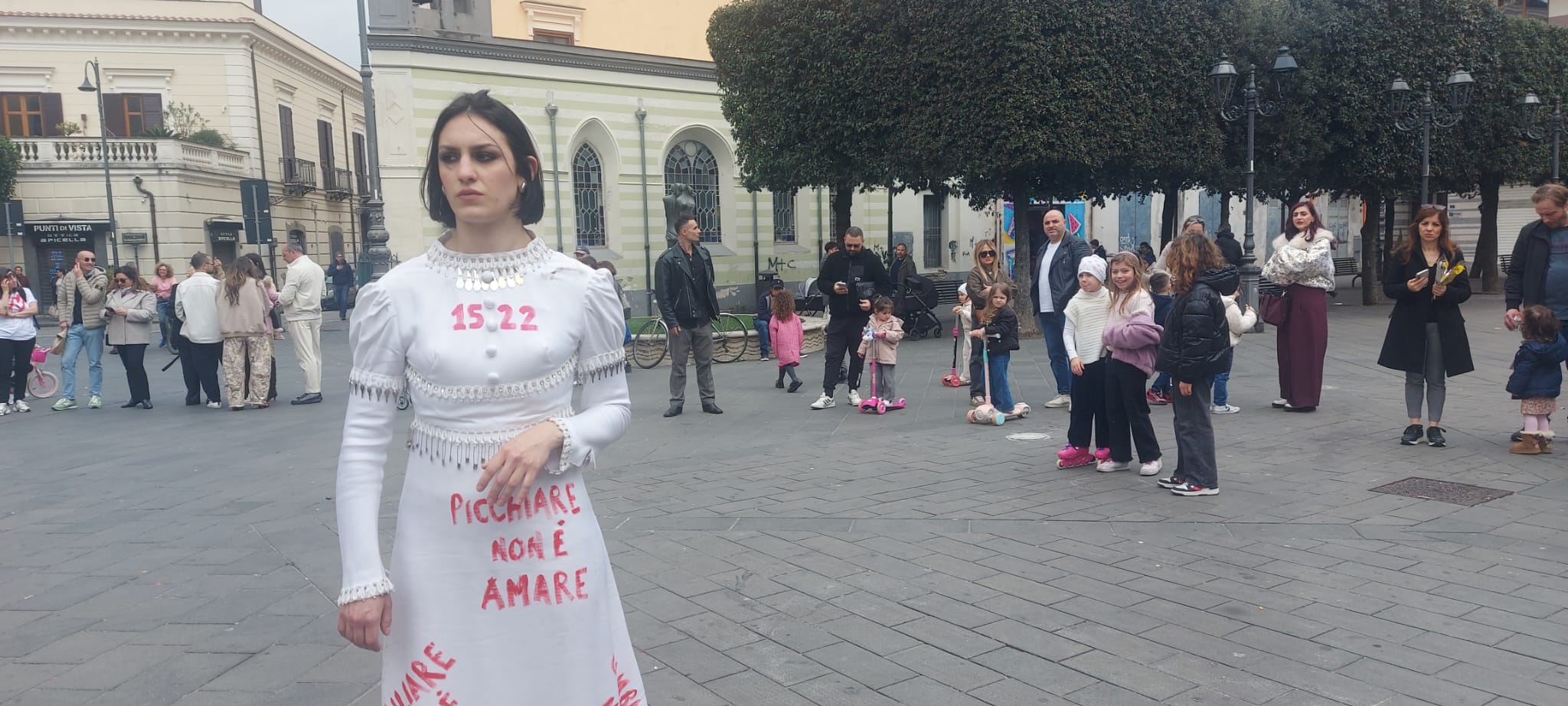 Forte come un pugno nello stomaco. Potente più di tanti proclami. Questa è stata la performance promossa da Nadia Petrosino stamane in piazza Diaz a Nocera Inferiore, nel giorno dedicato alla donna. Arte, moda e danza per gridare forte il dolore delle donne vittime di violenza, incarnato dalla performer Martina Salvucci che per un’ora e mezza ne è stata testimonial dolente e incrollabile al centro della piazza.