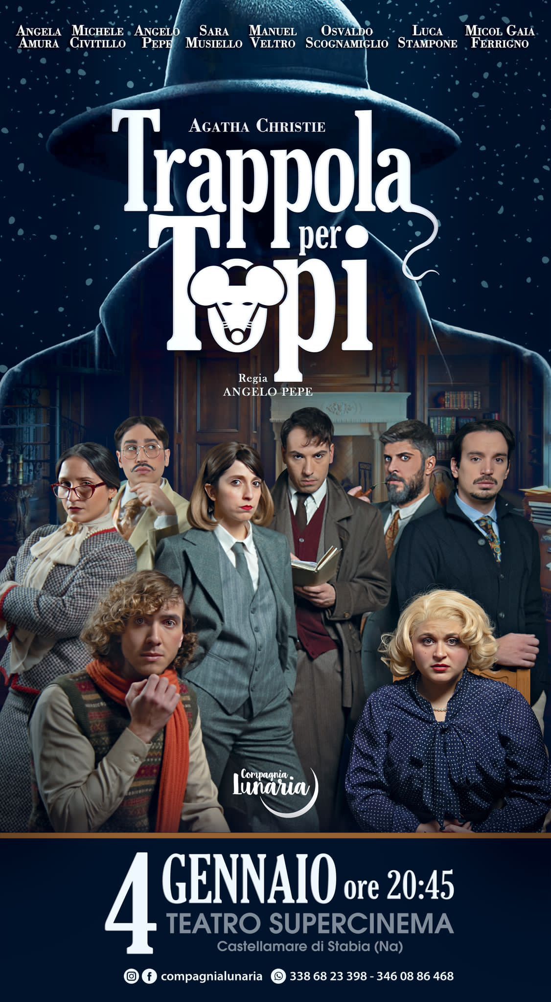Si apre il sipario, con il nuovo anno, per la Compagnia teatrale Lunaria di Torre Annunziata. Giovedì 4 gennaio alle 20,45, al teatro Supercinema di Castellammare di Stabia, va in scena “Trappola per topi”, il classico intramontabile della regina del giallo Agatha Christie, con la regia di Angelo Pepe, che dal 2015 insieme alla sua Compagnia riadatta e porta in scena spettacoli variegati, dalla commedia al drammatico.