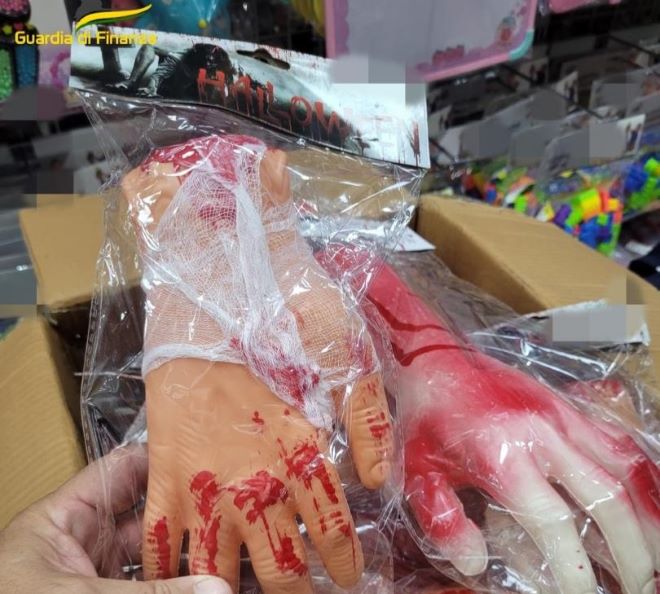 Mani da zombie, denti da vampiro, ali di pipistrello e sacche di sangue. Non è l’elenco di una pozione spettrale, ma solo alcuni dei tanti gadget pronti per rendere più spaventosa la notte di Halloween sequestrati dalla Guardia di Finanza della compagnia di Scafati. I militari hanno ritrovato oltre 11 mila articoli, non confermi ai parametri di sicurezza, all’interno di un noto esercizio commerciale dell’Agro nocerino sarnese, pronti per essere venduti per la festa della “notte delle streghe”.