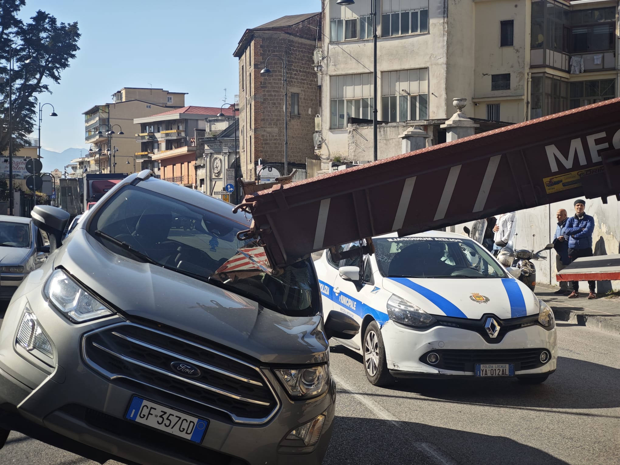 L’automobile è stata in parte attraversata da una lunga e pesante asse di ferro che ha mandato in frantumi il parabrezza. L’uomo alla guida si è salvato grazie alla sua prontezza riuscendo a ripararsi sotto il volante. Sul posto due pattuglie della polizia municipale guidate dal comandante Andrea D’Elia. Il traffico è rimasto paralizzato per alcune ore con conseguenze anche sulla vicina rotatoria di accesso allo svincolo di Nocera dell’A3 Napoli Pompei Salerno.