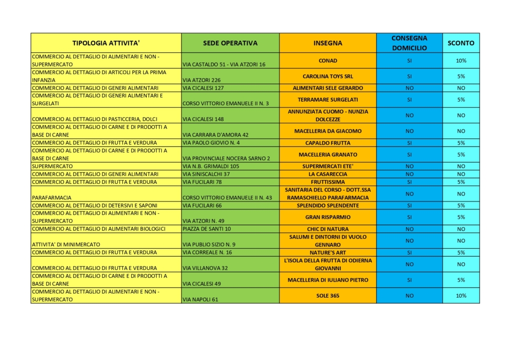 Cinque supermercati, dodici attività commerciali di generi alimentari, una per i bisogni per la prima infanzia, per l’igiene e una parafarmacia. Rientra anche un’attività di alimentari biologici. Alcune di queste mettono a disposizione sconti, che variano tra il 5 e il 10 per cento, e consegna a domicilio.