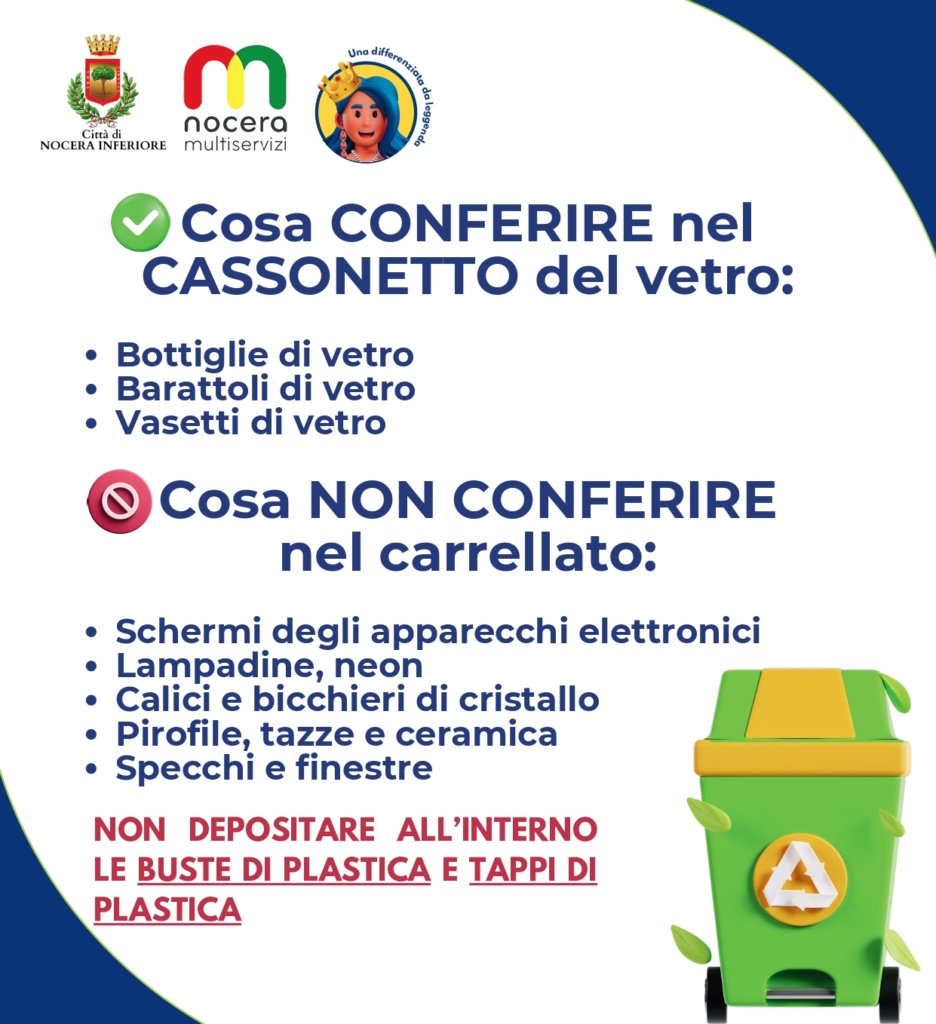 Dagli schermi dei telefonini alle suppellettili in ceramica. Ma anche piatti e bicchieri in cristallo, oppure specchi e finestre. Ma anche altre tipologie di rifiuti. Non sembra decollare il corretto conferimento del vetro “porta a porta” varato dal Comune di Nocera Inferiore e dalla Nocera Multiservizi il 9 aprile scorso. Ad un mese di distanza si corre ai ripari con una nuova campagna di informazione e sensibilizzazione dei cittadini.