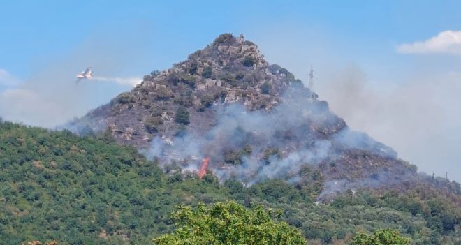 Necessario l’intervento di un aereo per domare il rogo che sta devastando colle Solano, altura che ospita Rocca San Quirico