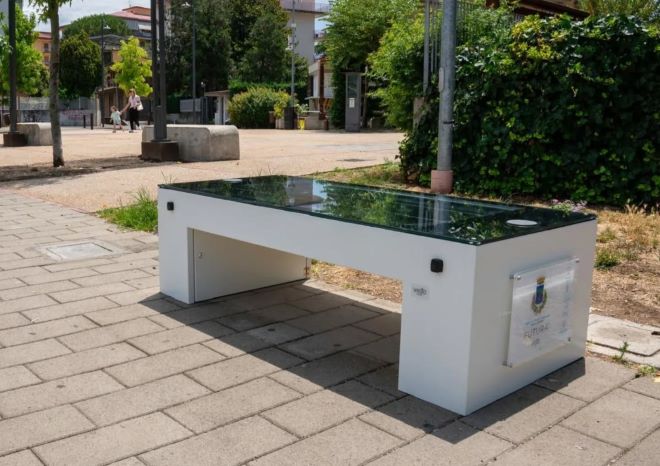 Sarà possibile accomodarsi su una panchina interconnessa con l’ambiente che la circonda, dal design moderno e realizzata con pannelli solari integrati in grado di trattenere la luce solare o artificiale e rilasciarla nelle ore notturne. Grazie a questo sistema, la stessa panchina intelligente diviene retroilluminata al calar del sole senza alcuno spreco di energia. Stando comodamente seduti sulla panchina, sarà possibile ricaricare il proprio smartphone o dispositivo elettronico poggiandolo semplicemente sul vetro accanto alla seduta occupata, o collegando col cavo del caricatore.