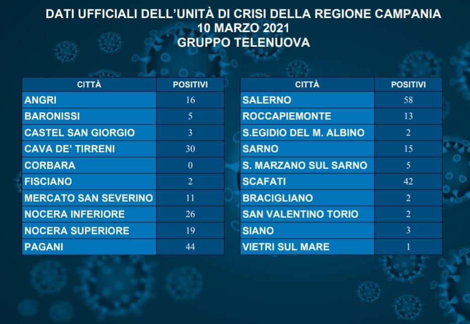 L’elevato numero di contagi riscontrati oggi in Campania, è stata superata quota 3.000, si riflette anche su parte della provincia di Salerno dove la situazione resta complessa anche per la pressione sugli ospedali. La città capoluogo è tornata a guidare la classifica dei tamponi positivi, oggi sono 58. Migliora leggermente Pagani che oggi conta 44 positivi, ieri erano 57. Non va meglio a Scafati con 42 contagi. Il virus torna a far paura a Cava de’ Tirreni dove il dato è di 30 tamponi positivi. A seguire Nocera Inferiore con 26 nuovi contagiati, poi Nocera Superiore con 19, Angri 16, Sarno 15 e Roccapiemonte 13. Tutte le altre città, invece, registrano un calo del contagio.