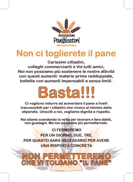 “Ci fermeremo per un giorno, forse due o tre, ma non aumenteremo il prezzo del pane così come ci vogliono indurre”. È uno dei passaggi fondamentali della nota diramata dall’Associazione Panificatori della provincia di Salerno che torna a denunciare lo smisurato costo, non solo dell’energia come gas ed elettricità, ma anche delle materie prime.