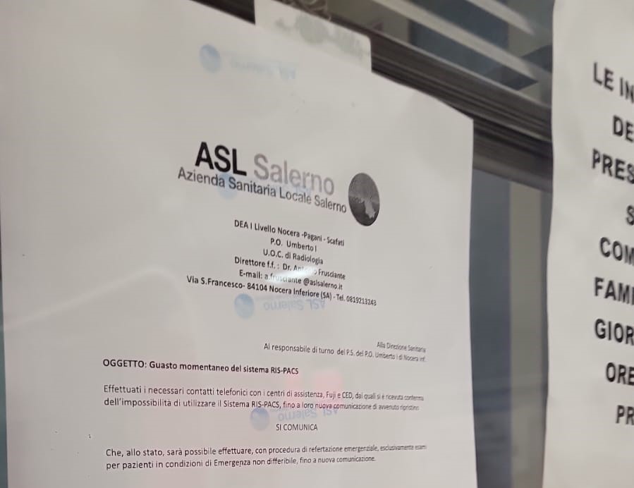 Parzialmente chiuso il pronto soccorso dell’ospedale Umberto I di Nocera Inferiore. Dal pomeriggio di oggi, come scrive Il Mattino, il reparto ha accettato soltanto casi di emergenza “non differibili”. Un guasto del sistema Ris Pacs del reparto di diagnostica per immagini, ha costretto la direzione sanitaria dell’ospedale a sospendere dalle 15, 30 la presa in carico della quasi totalità dei pazienti. Impossibile refertare, infatti, radiografie ed ecografie. Molti ammalati, in attesa anche da diverse ore, sono stati obbligati a lasciare l’atrio del pronto soccorso e individuare un altro ospedale dove poter richiedere le cure.