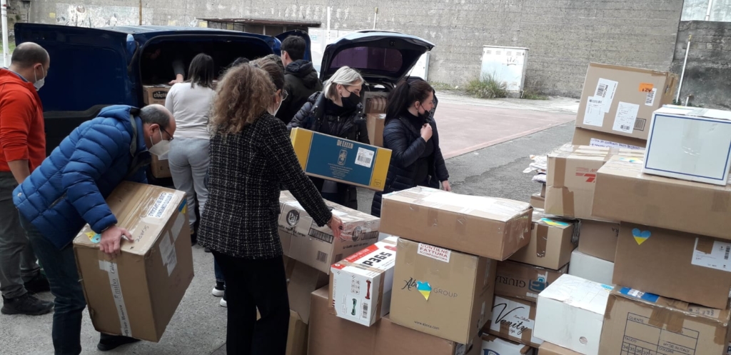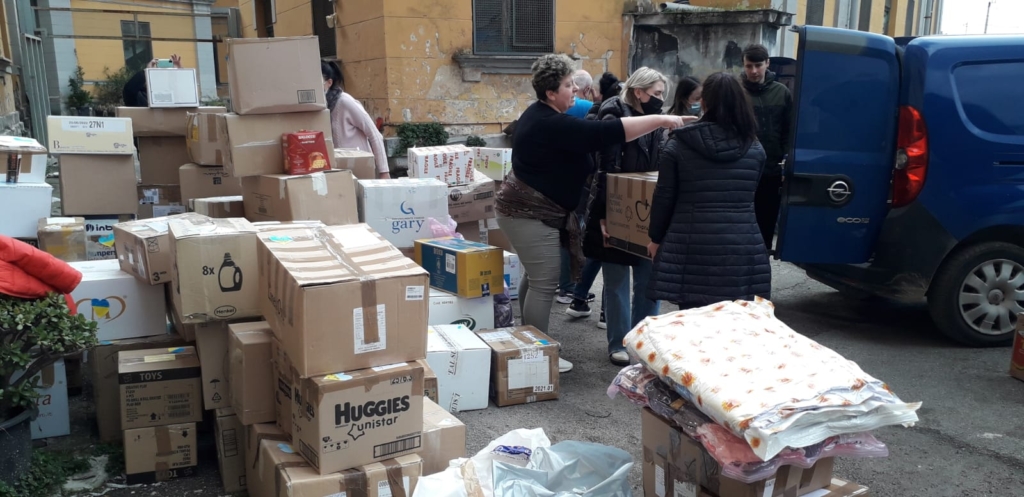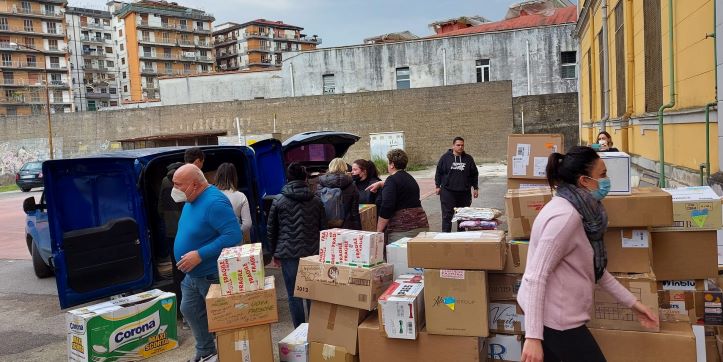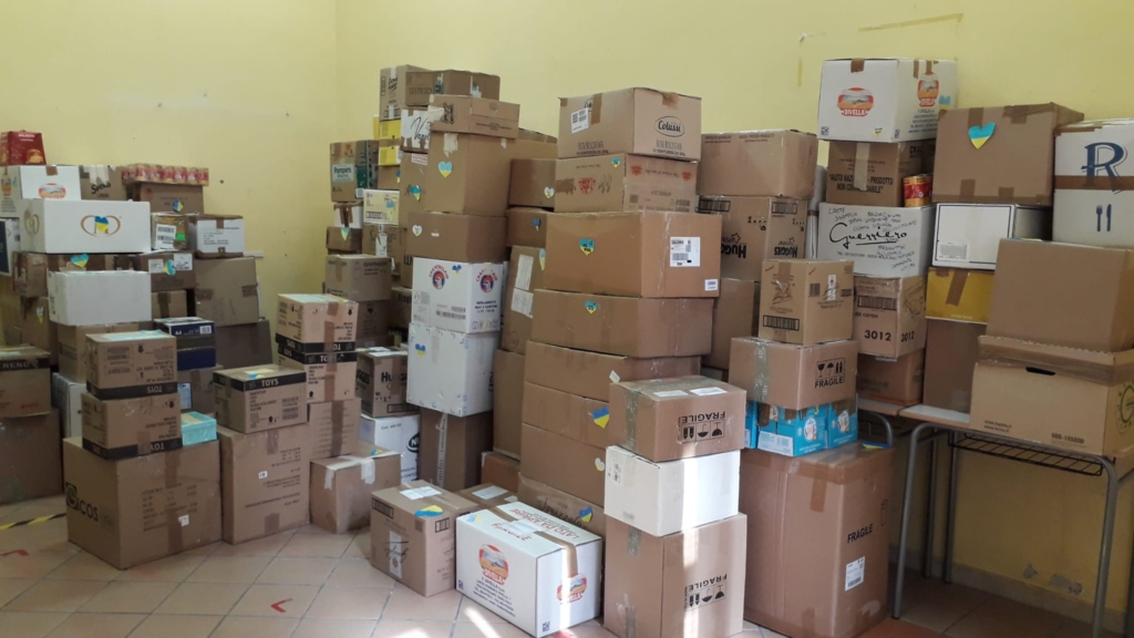 Nel pomeriggio volontari ucraini hanno ritirato gli scatoloni per portarli a Pompei dove padre Igor Stus, guida spirituale dei cittadini ucraini di religione cattolica bizantina, ha creato in un grande locale del santuario pontificio un deposito di stoccaggio, beni che vengono, poi, inviati in Ucraina.