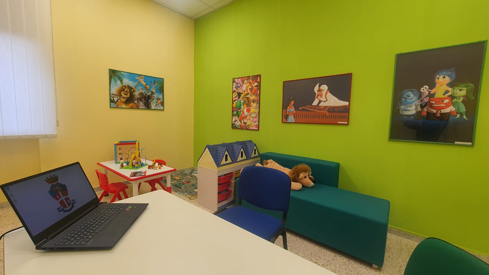 Le pareti verde tenue, simbolo di speranza, gli angoli con giochi per bambini, un divano accompagnato da un grande leone di peluche e stampe ispirate al mondo Disney compongono un ambiente studiato per far sentire a proprio agio chi si trova ad affrontare il momento delicato della denuncia. A completare l’allestimento, una scrivania, alcune sedie e un computer per lo svolgimento delle attività operative.