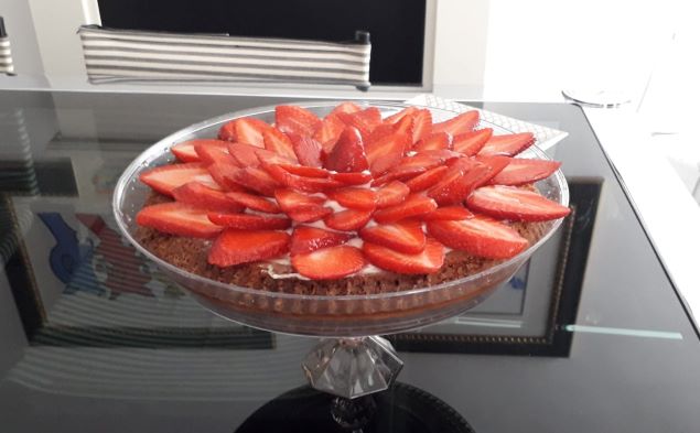 INGREDIENTI: Per la base: 2 uova, 140 g di zucchero, 160 ml di olio di semi di girasole, 60 ml di latte, 170 g di farina, ½ bustina di lievito. Per la bagna: 1 bicchierino di limoncello o succo di limone e ½ bicchiere di acqua zuccherata. Per la crema: ½ l di latte, buccia di 1 limone, 2 uova, 75 g di zucchero, 35 g di amido di mais. Per la decorazione: gelatina per dolci e fragole.