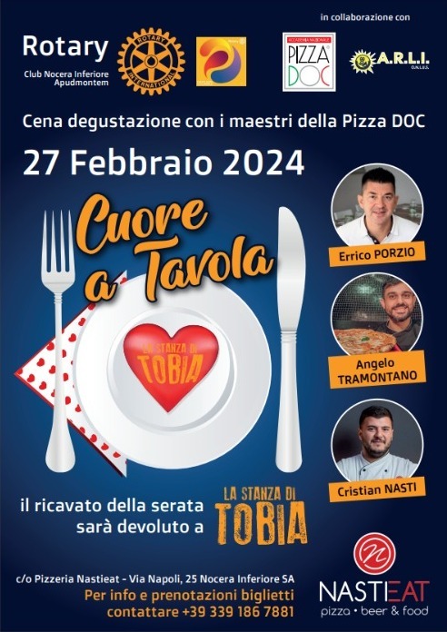 Mangiare una pizza non ha mai fatto così bene al cuore. Soprattutto se si aiutano i bambini ammalati. Martedì 27 febbraio, presso la pizzeria “Nasteat” di Nocera Inferiore, il Rotary Club “Apudmontem” di Nocera Inferiore e l’Accademia Nazionale Pizza Doc organizzeranno una cena di beneficenza “Cuore a tavola” in sostegno del progetto “La Stanza di Tobia”.
