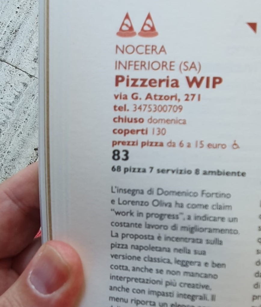La recensione fatta dai curatori di Gambero Rosso evidenzia la grande qualità della pizza proposta da WIP. Essa, si legge nella guida, “è incentrata sulla pizza napoletana nella sua versione classica, leggera e ben cotta, anche se non mancano interpretazioni più creative, anche con impasti integrali”.