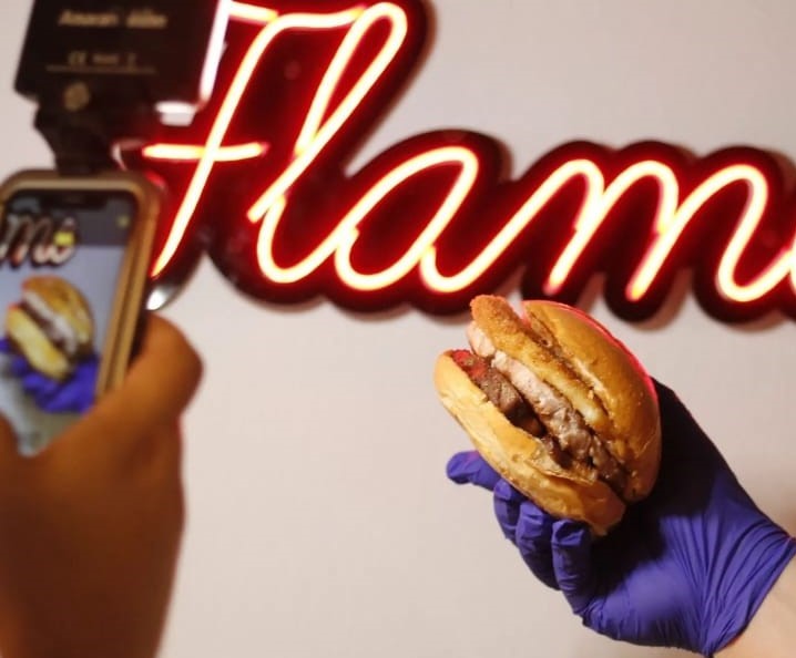 Flame, dall’inglese fiamma, identifica immediatamente il prodotto che offre ai visitatori, la carne nelle sue diverse rivisitazioni, hamburgher in particolare. Ma c’è dell’altro, la pizza in pala, una vera novità.