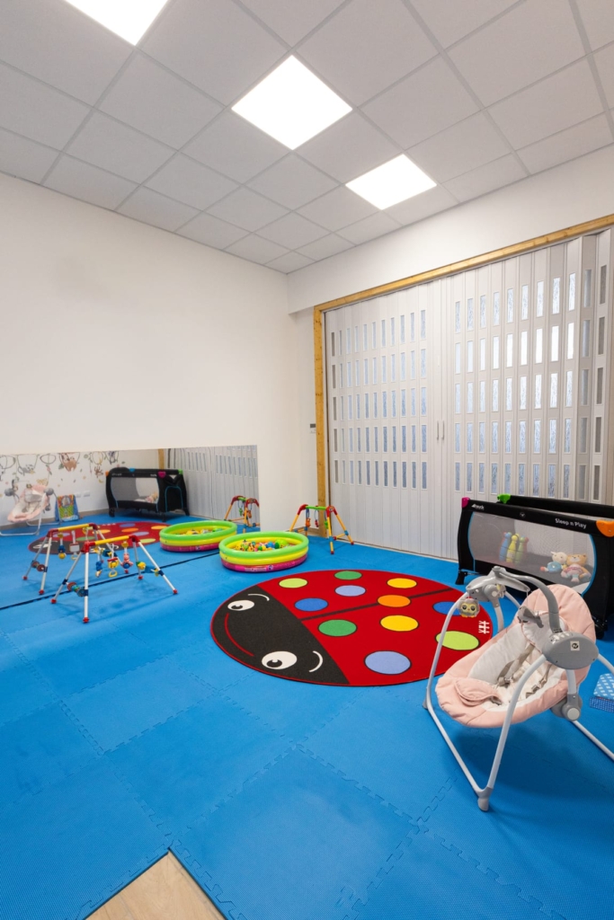 La prima aula che si incontra è quella dedicata ai lattanti, i bambini da 3 a 12 mesi. È divisa in due da una porta scorrevole che, a seconda delle esigenze, consente di utilizzare l’intera ampia metratura. “Le attrezzature e gli arredi – sottolinea Sara – sono adatte alle delicate esigenze di questa fascia di età. È presente una parete specchiata costituita da superficie riflettente certificata, fatta di uno specchio speciale antisfondamento. È uno strumento educativo importante nella costruzione dell’identità del bambino. Lo sostiene nella rappresentazione mentale del corpo, del volto e, quindi, di sé”.