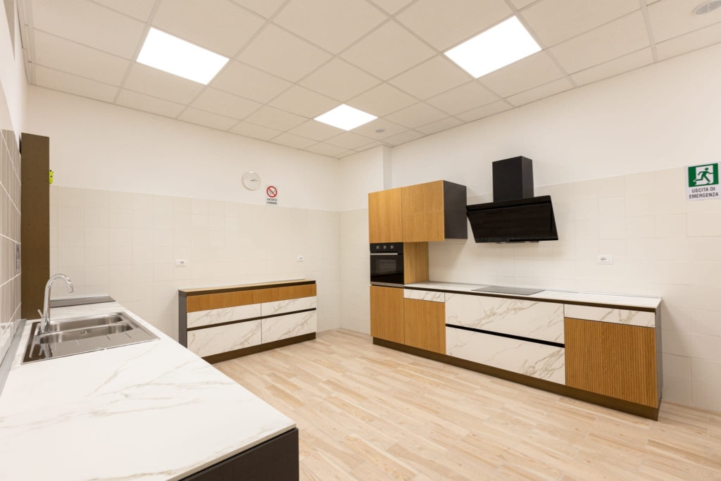 Poi lo spazio che non ti aspetti. Ospita una grande e moderna cucina. “Il nostro gioiello” sorridono le due educatrici. “I mobili – dice Antonietta – sono in ceramica, superficie liscia e non porosa che riduce la possibilità di accumulo di batteri, impedendone anche la proliferazione. Avere una mensa interna permette di offrire ai bambini pasti sani e bilanciati, preparati con ingredienti freschi e di qualità”. Cocco & Drilli utilizza il protocollo della Regione Campania denominato “Tutti a tavola” e ideato dagli specialisti esclusivamente per gli asili nido dettandone le linee guida.