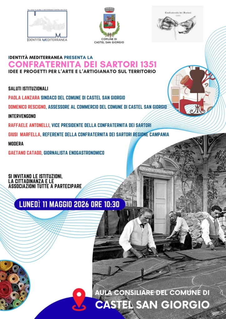 L’appuntamento è per lunedì 11 maggio 2026 alle ore 10:30, presso l’aula consiliare del Comune di Castel San Giorgio, la Confraternita dei Sartori, realtà associativa che si propone di custodire e rilanciare l’antica tradizione sartoriale napoletana. L’iniziativa si svolgerà alla presenza del sindaco Paola Lanzara e dei rappresentanti dell’amministrazione comunale, in collaborazione con l’associazione culturale Identità Mediterranea che ha ispirato l’evento.