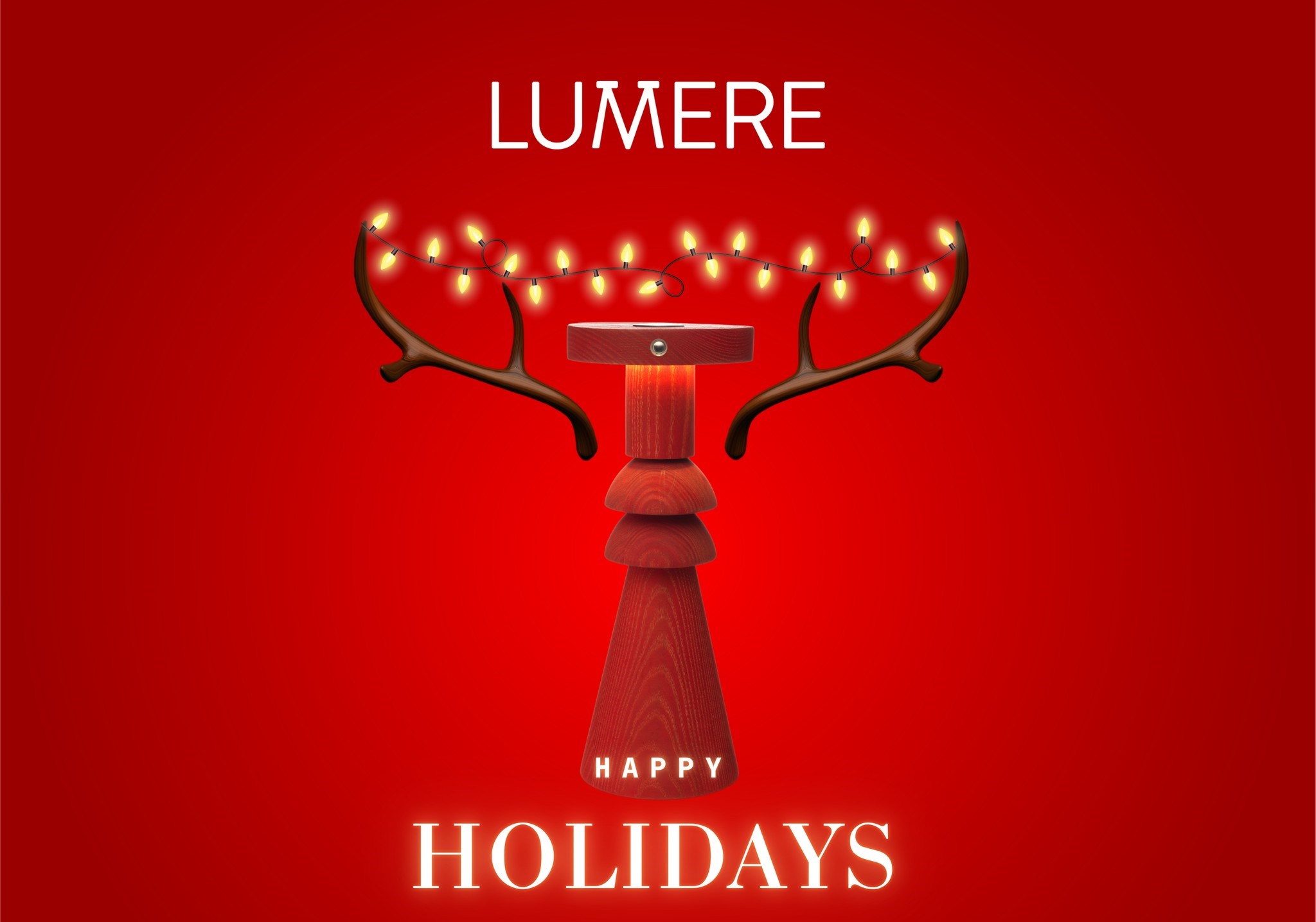 Protagonista dell’elaborazione è Scacco Matto, una delle lampade più iconiche del catalogo Lumere, disegnata da Francesco Cappuccio. Un oggetto ormai riconoscibile per il suo equilibrio formale e la sua forte personalità, che per l’occasione natalizia è stato reinterpretato con un intervento leggero ma evocativo: alla lampada sono stati aggiunti un paio di palchi da alce, decorati con piccole lucine natalizie.