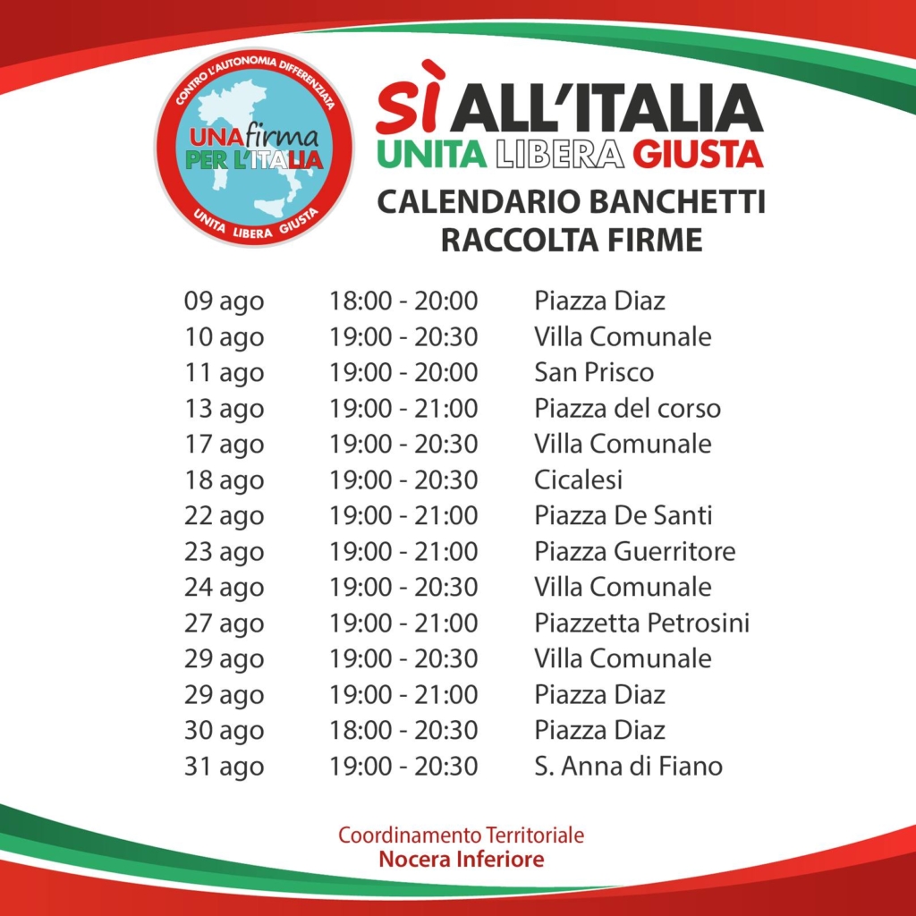 Nonostante il periodo vacanziero in strada ci saranno molti più banchetti per spiegare le ragioni del no alla legge del governo Meloni sull’autonomia differenziata. Il comitato territoriale di Nocera Inferiore, coordinato da Lino Picca, ha diffuso il calendario della raccolta delle firme che da questa sera, venerdì 9 agosto dalle 18 in piazza Diaz, sino al prossimo 31 agosto.