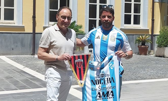 E sulla casacca celeste è ben evidente la scritta “Nocera”, il nome della birra artigianale che produce Cristian. Non a caso sul sito della birra Nocera c’è la foto del castello Fienga che domina la città. Un chiaro segno che il legame tra la famiglia De Simone e Nocera non è mai svanito. “Sogno di tornare nuovamente qui a Nocera -ha detto commosso Cristian De Simone – e di sedere un giorno in tribuna per assistere da vicino una partita della Nocerina e vivere con la mia famiglia le emozioni del tifo rossonero”. Il club rossonero ha regalato all’imprenditore argentino un gagliardetto del club, con l’augurio che questo giorno possa avverarsi nel più breve tempo possibile.