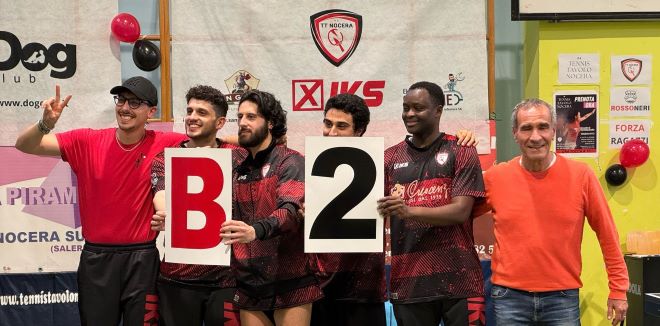 Sognata e inseguita a lungo, il Tennistavolo Nocera conquista la sua prima storica promozione in Serie B2, a consacrare una stagione maiuscola. Lacrime e commozione sul volto del patron Giovanni Landino, il vulcanico presidente ha finalmente libero tutte le sue emozioni al termine dell’ultimo set che ha decretato il 5-1 conquistato dai suoi ragazzi contro il Tt Torre del Greco, in una palestra Marco Polo gremita come non mai.